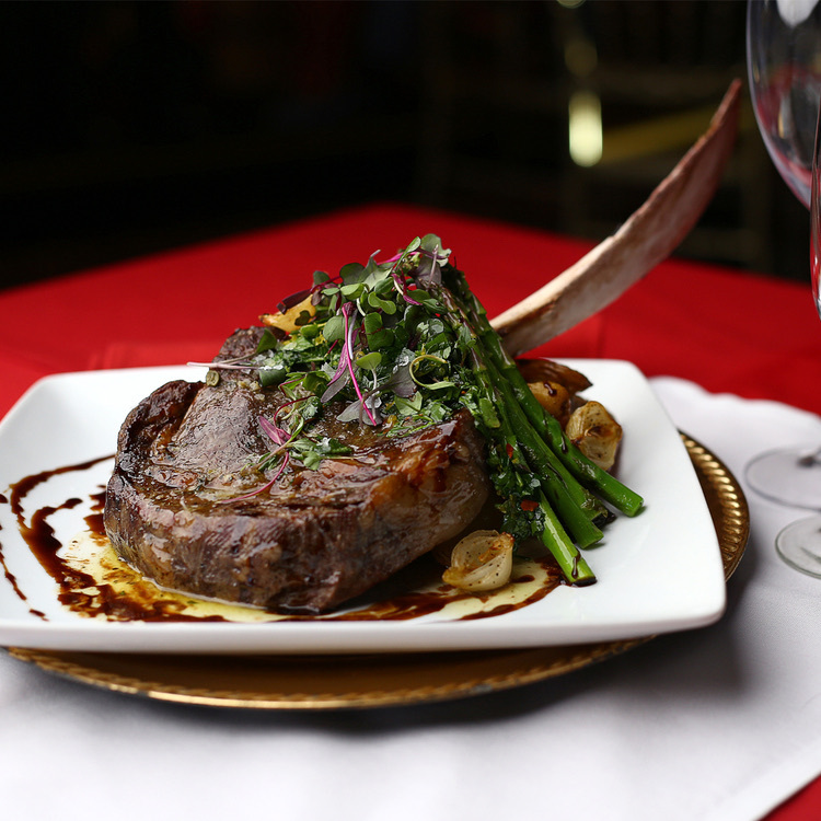 A massive 32 ounce, grass fed Tomahawk Steak prepared by sous vide and finished with house compound butter, creamy garlic/herb mashed potatoes, chimichurri, seasonal vegetables. INCLUDES ALL 3 COURSES
