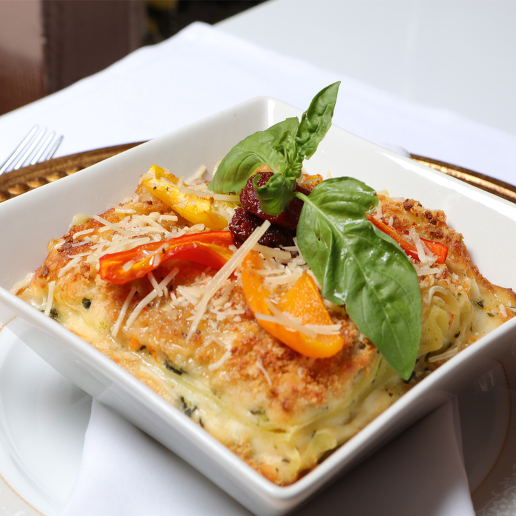 (Available July-December 2026) Baked layered pasta with a creamy three-cheese béchamel, seasonal vegetables, and a golden herb crust. INCLUDES ALL FIVE COURSES.